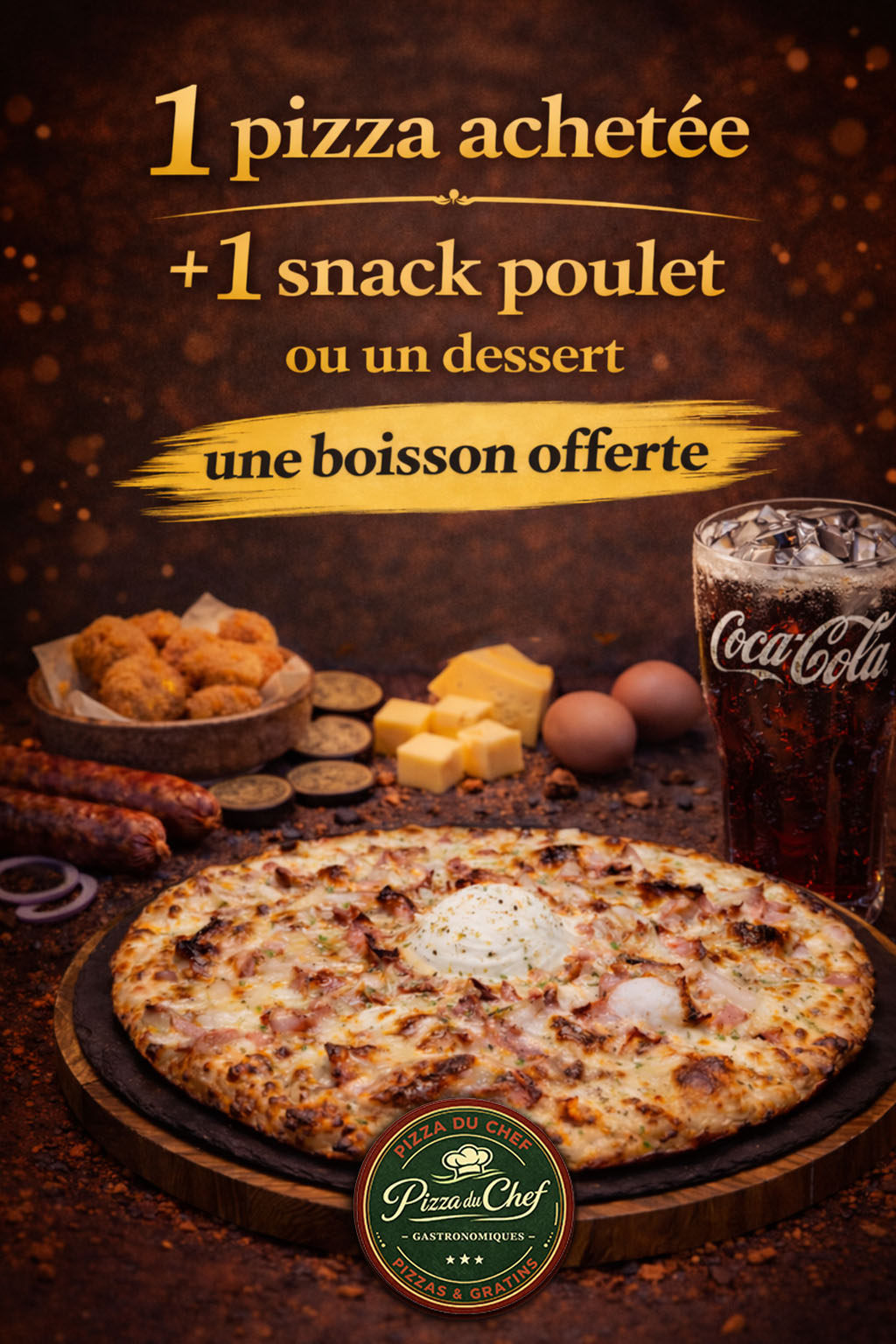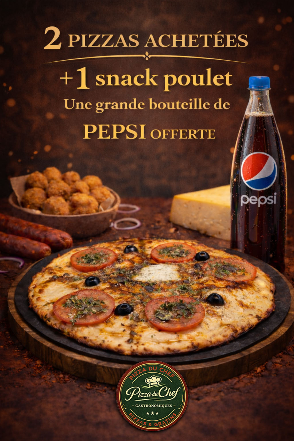 SOFRENCH : Sauce tomate du Chef, mozzarella 100%, jambon blanc & cru, camembert, olives