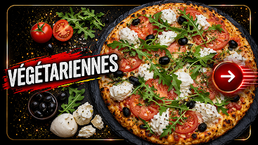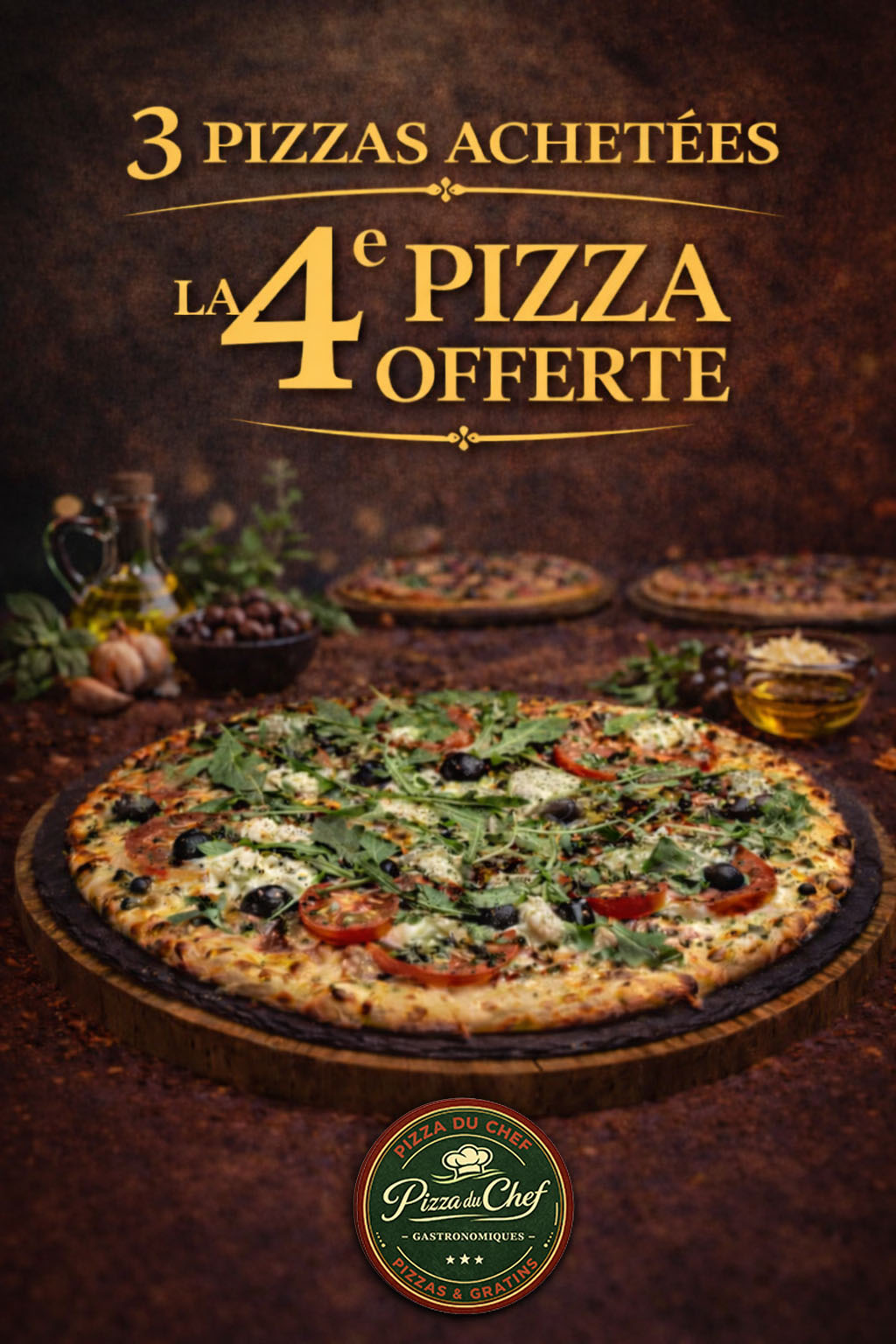 MARGHERITA DU CHEF : Sauce tomate maison, mozzarella 100 %, rondelles de tomate, olives, roquette, Comté AOC, origan.