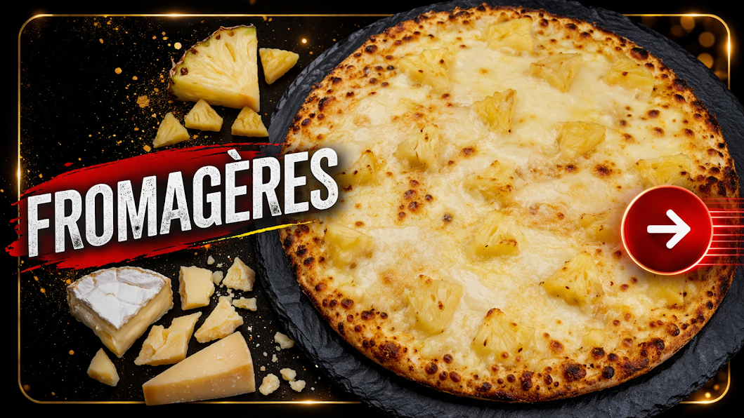 CAMPAGNARDE : Crème fraîche, mozzarella 100 %, Lardons, raclette, pommes de terre rissolées, oignons.