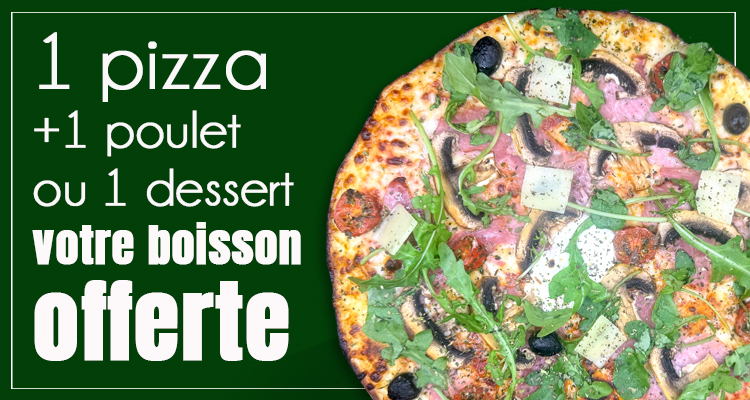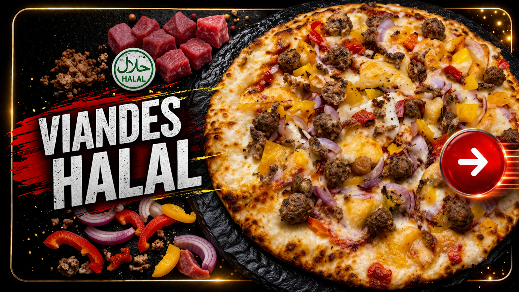 PESTO POULET CHEVRE : Crème fraîche, mozzarella 100 %, poulet, chèvre, pesto, oignons, origan.(halal)