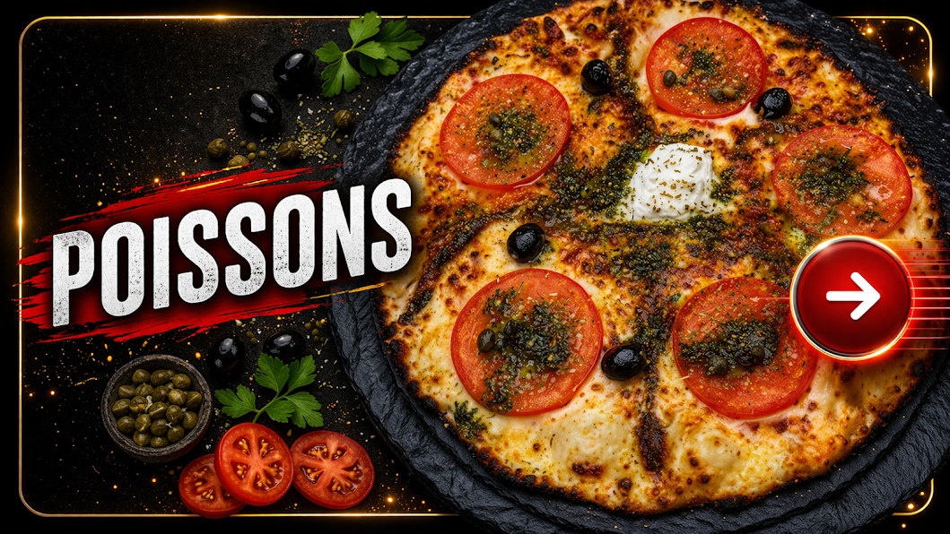 PESTO JAMBON LARDON CHEVRE : Crème fraîche, mozzarella 100 %, jambon blanc, lardons, chèvre, pesto, oignons, origan.