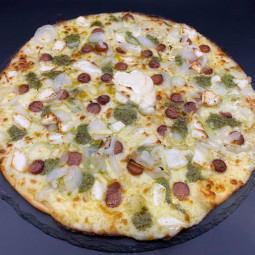 PESTO JAMBON LARDON CHEVRE : Crème fraîche, mozzarella 100 %, jambon blanc, lardons, chèvre, pesto, oignons, origan.